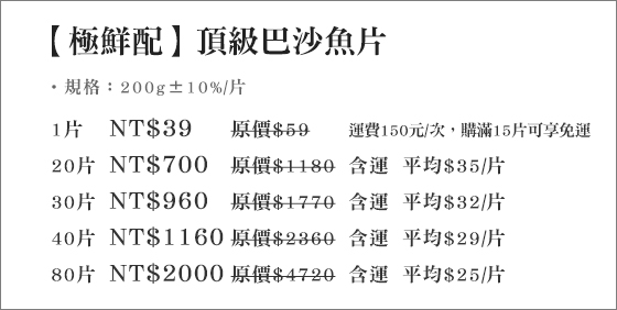 商品訊息簡述: 平均每片最低只要25元起即可購得【極鮮配】頂級巴沙魚片1片/20片/30片/40片/80片(200g±10??),購滿15片可享免運。