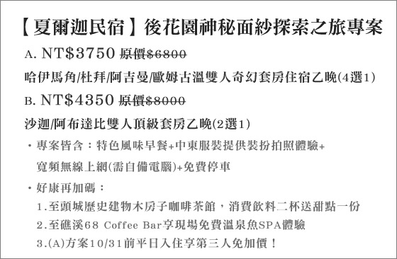 商品訊息簡述: 只要3750元起(雙人價)即可享【夏爾迦民宿】原價最高8000元後花園神秘面紗探索之旅專案:(A)哈伊馬角/杜拜/阿吉曼/歐姆古溫雙人奇幻套房住宿乙晚(4選1)/(B)沙迦/阿布達比雙人頂級套房乙晚(2選1),專案皆含:特色風味早餐+中東服裝提供裝扮拍照體驗+寬頻無線上網(需自備電腦)+免費停車。好康再加碼:1.至頭城歷史建物木房子咖啡茶館,消費飲料二杯送甜點一份、2.至礁溪68 Coffee Bar享現場免費溫泉魚SPA體驗、3.(A)方案10/31前平日入住享第三人免加價!